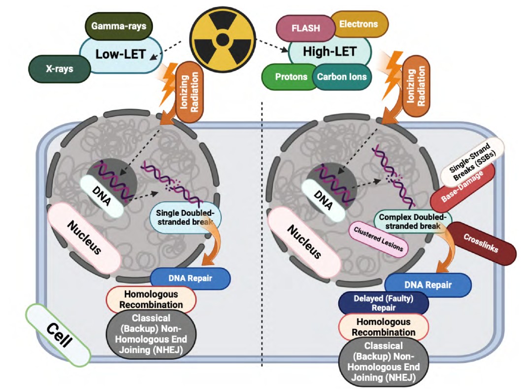 A critical determinant of the biological effectiveness of radiation therapy is linear energy transfer (LET), which measures the energy deposited by radiation per unit distance travelled in tissue [23]. The High-LET radiation, such as alpha particles or neutrons, creates dense ionization tracks, resulting in more severe macromolecular damage and increased cell lethality compared to low-LET radiation like X-rays or gamma rays [24]. This heightened damage includes double-strand breaks (DSBs) in DNA [25], a pivotal factor in inducing apoptosis, necrosis, or cellular senescence. Also, The High-LET radiation could engage specific DNA repair pathways, with non-homologous end-joining (NHEJ) being particularly critical [24]. Notably, defects in NHEJ pathways lead to heightened radiosensitivity across various LET ranges, emphasizing the central role of repair mechanisms in determining radiation-induced cell fate (Figure 3) [25, 26].