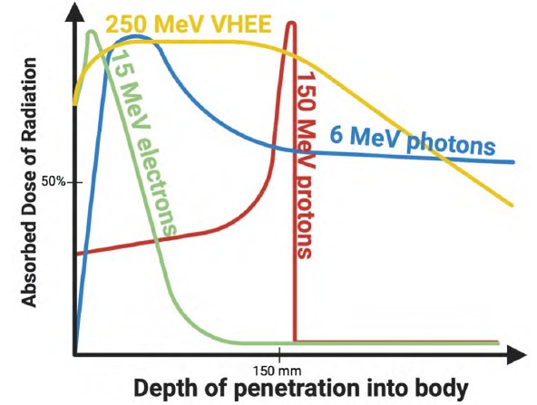 The penetration depth of electron beams is highly dependent on their energy and the atomic composition of the irradiated material [32]. Low-energy electron beams (6–20 MeV) are well-suited for treating superficial malignancies, as their limited penetration depth ensures dose delivery primarily to the skin and shallow tissues, sparing underlying structures [33]. On the other hand, Very High-Energy Electrons (VHEEs), with energies exceeding 100 MeV, provide the capability to treat tumors located at depths of 5–15 cm while maintaining dose conformity even in heterogeneous tissues such as the lungs and bones [34, 35]. These properties position VHEEs as a potential alternative to photon and proton therapies for certain clinical applications (Figure 5).