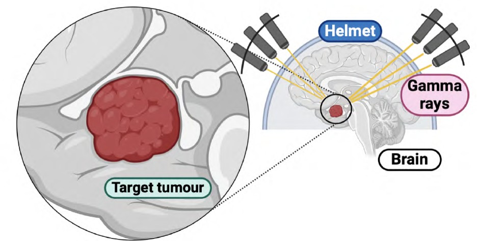 Fig. 6. Schematic representation of Gamma Knife radiosurgery. The diagram illustrates the precise targeting of a brain tumor (target tumour) using converging gamma rays, delivered through a specialized helmet. The focused radiation beams spare the surrounding healthy brain tissue, demonstrating the non-invasive and localized nature of the treatment