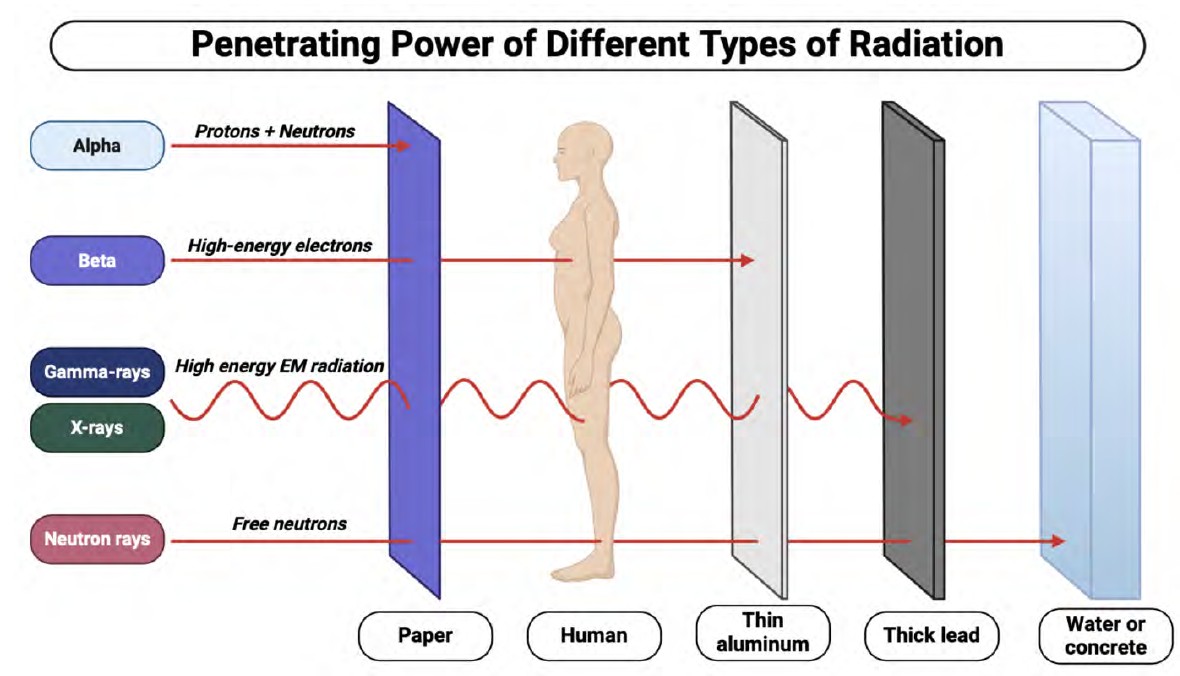 Fig. 7. Comparative penetrating power of various radiation types through different materials