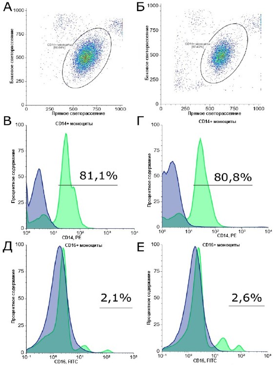 Рис. 1. Репрезентативные дот-плот диаграммы бокового и фронтального светорассеяния пробы контрольной группа (А) и группы ПЭ (Б). Репрезентативные гистограммы окрашивания анти-CD14 (В, Г) и анти-CD16 антителами (Д, Е) (зеленая заливка) пробы контрольной группа (В, Д) и группы ПЭ (Г, Е). Неокрашенный контроль — синяя заливка. Процент положительных клеток указан над маркером
