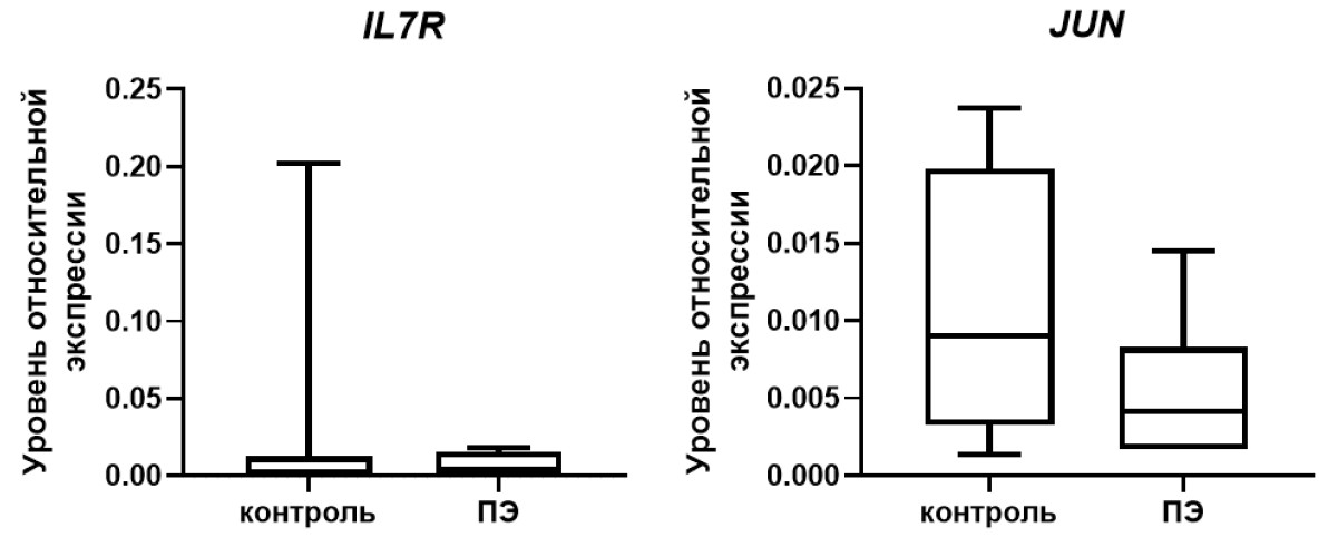 Рис. 2. Уровень относительной экспрессии генов IL7R и JUN в классических CD14+ моноцитах от пациенток с физиологической беременностью (контроль) и пациенток с ПЭ