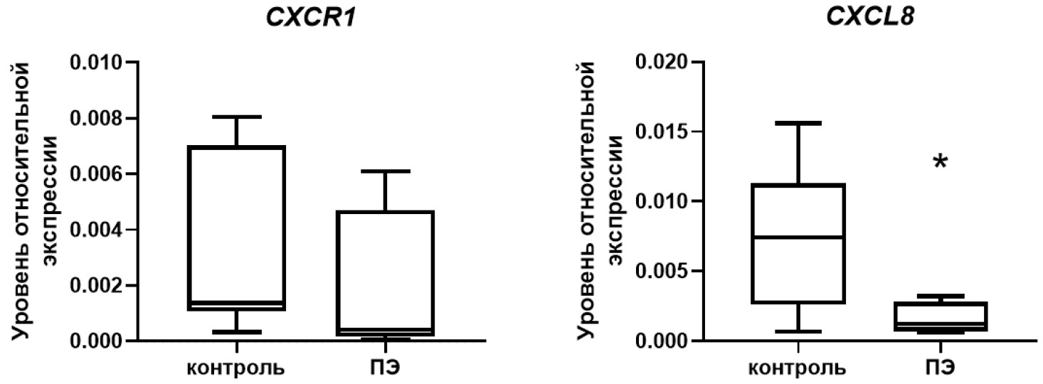 В случае гена CXCL8 мы наблюдали значимое снижение его экспрессии в классических моноцитах от пациенток с ПЭ по сравнению с моноцитами от пациенток контрольной группы (рис. 3). CXCL8, также известный как интерлейкин‑8 (IL‑8), является хемокином-лигандом исследованного нами выше гена рецептора CXCR1 [24, 25].