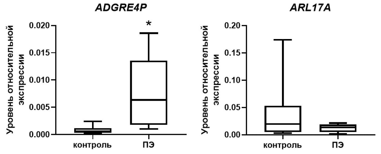 Рис. 4. Уровень относительной экспрессии генов ADGRE4P и ARL17A в классических CD14+ моноцитах от пациенток с физиологической беременностью (контроль) и пациенток с ПЭ. *p<0,05