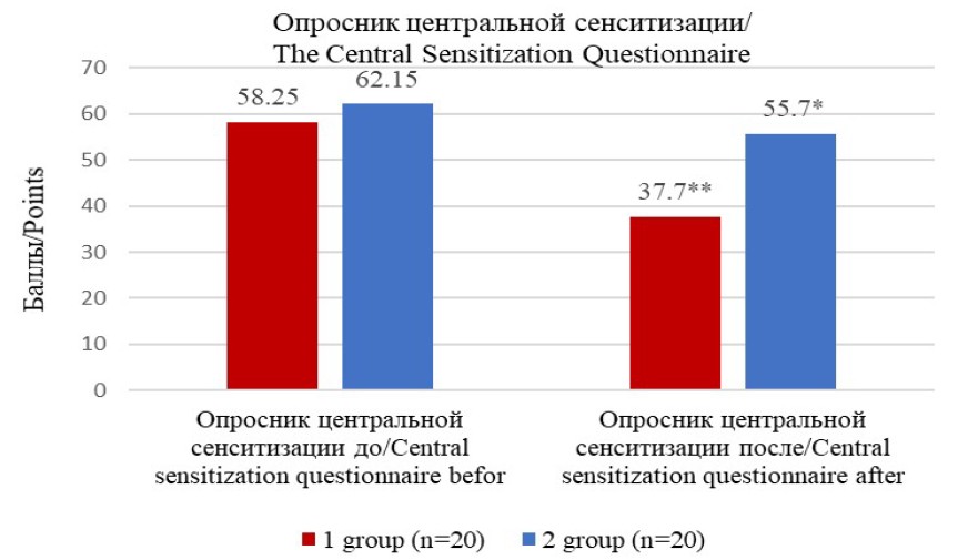 Согласно подсчетам, до эксперимента показатели болевой чувствительности исследуемых женщин в 1 и 2 группах значимо не отличались друг от друга по данным ВАШ, опросника центральной сенситизации, опросника DN 4 до эксперимента (p >0.05). Анализ результатов исследований до и после реабилитационных мероприятий выявил достоверное снижение показателей боли в 1 и 2 группах согласно ВАШ, опроснику центральной сенситизации, опроснику DN 4. При этом в первой группе женщин было выявлено более выраженное уменьшение болевой чувствительности согласно ВАШ, опроснику центральной сенситизации, опроснику DN 4 (p <0.01) относительно 2 группы (p <0.05) (Рис. 1, 2).