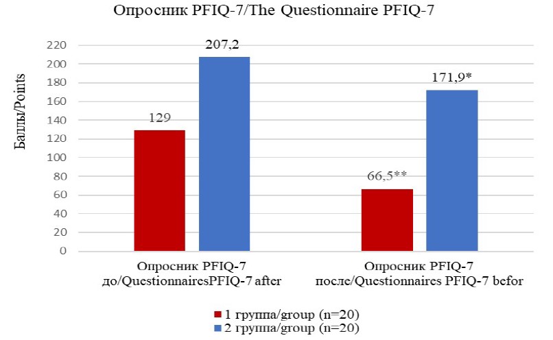Согласно опроснику PFIQ‑7 психологические показатели между 1 и 2 группами имели значительную разницу (p <0.01). После проведения эксперимента значения опросника PFIQ‑7 снизились в 1 группе (p <0.01) и 2 группе (p <0.05). Показатели качества жизни по опроснику PFIQ‑7 значительно улучшились в 1 группе по сравнению со 2 группой (p <0.01) (Рис. 3).