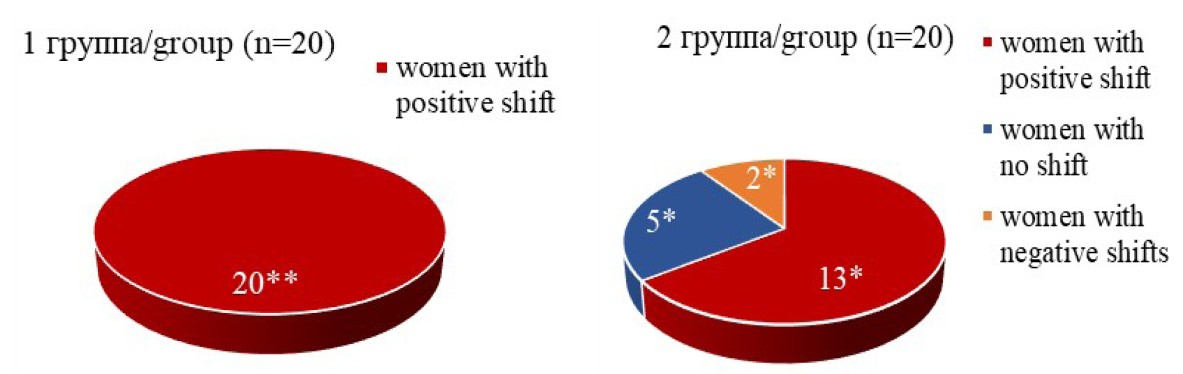 Таким образом, мы выявили, что все женщины в 1 группе при исследовании Индекса Кердо, получили улучшение показателей (Z <0.01). Во 2 группе мы наблюдали улучшение показателей Индекса Кердо у меньшего количества испытуемых, при этом наблюдались ухудшения результатов и отсутствие изменений в показателях Индекса Кердо (Z <0.05). После проведения эксперимента в 1 группе 8 пациенток с выраженными симпатическими проявлениями перешли в группу с умеренными симпатическими проявлениями, 2 пациентки продемонстрировали признаки эйтонии, перейдя из группы с умеренными симпатическими проявлениями. 5 женщин с выраженными парасимпатическими проявлениями перешли в группу с умеренными парасимпатическими показателями. Во 2 группе после реабилитационных мероприятий ни у одной из пациенток не наблюдались показатели эйтонии. 2 женщины перешли в группу с умеренными симпатическими проявлениями из группы с выраженными симпатическими показателями. В группах пациенток с выраженными и умеренными парасимпатическими показателями динамика не наблюдалась.