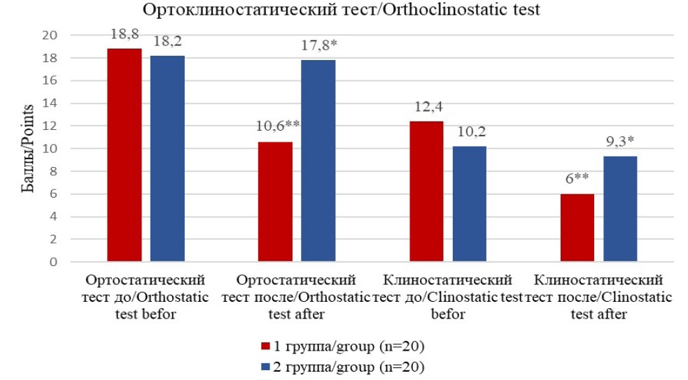 Для анализа орто- и клиностатических проб мы оценивали разницу в показателях частоты сердечных сокращений (ЧСС) женщин при изменении положения тела (для ортостатической пробы — учащение ЧСС при переходе из горизонтального положения в вертикальное, для клиностатической пробы — урежение ЧСС при переходе из вертикального положения в горизонтальное). Данные орто- и клиностатических проб в 1 и 2 группах перед проведением эксперимента значимо не отличались друг от друга (p> 0.05). После проведения реабилитационных мероприятий мы наблюдали уменьшение разницы показателей ЧСС в орто- и клиностатических пробах в обеих группах. В 1 группе уменьшение параметров было более значимо (p < 0.01), чем во 2 группе (p < 0.05) (Рис. 6).