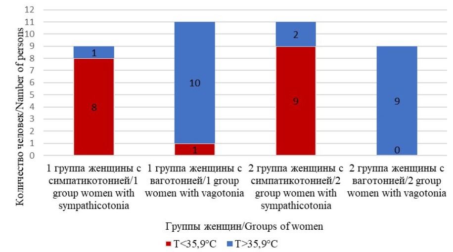На сегментарном уровне мы исследовали вегетативную нервную регуляцию женщин с помощью температурных показателей тепловизора, ориентируясь на рефлекторные зоны Захарьина-Геда и топографические зоны блуждающего нерва в области шеи справа и слева. Для анализа полученных результатов женщины каждой группы были разделены на категории в соответствии с вегетативным статусом — с симпатикотоническим и ваготоническим типами реакций.