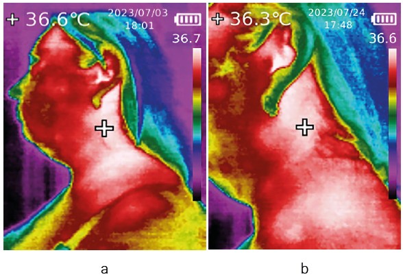 Рис. 8. Пример температурных показателей в топографической области блуждающего нерва у пациентки Ч. с ваготоническим типом реакции: a —до эксперимента; b — после эксперимента