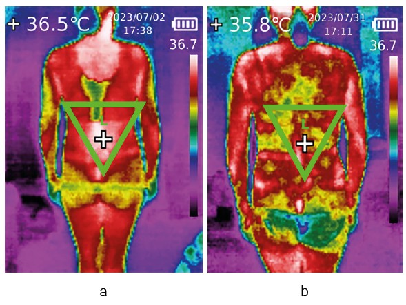 Рис. 9. Пример температурных показателей в рефлекторной зоне Захарьина-Геда на уровне Th12 у пациентки С.: a — до эксперимента; b — после эксперимента