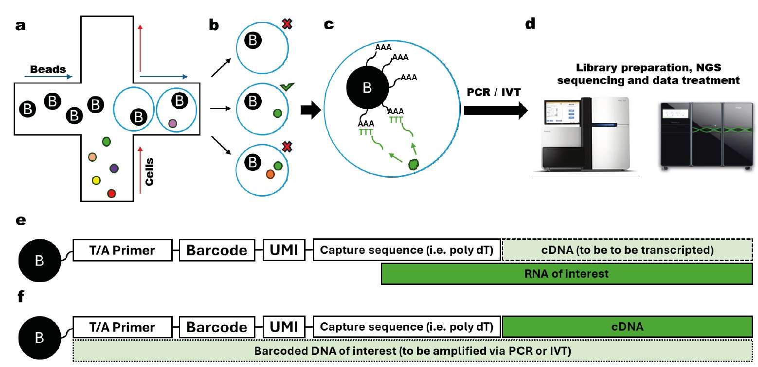 Fig. 1. Schematic of the scRNA-seq experiment. A mixture of beads, cells, and reagents is pumped through an orthogonal fluidic system to form droplets via a reverse emulsion (a). The system parameters are adjusted to maximize the ratio of single cell captures per droplet while minimizing double captures (b). Each droplet is an individual mini-reaction chamber containing all the necessary reagents for cell lysis, reverse transcription, and amplification (c), thus generating large quantities of barcoded DNA complementary to the cellular transcriptome, suitable for subsequent NGS sequencing (d). Each individual bead contains on its surface numerous complex primers, including in their composition both identical regions necessary for, for example, transcription or amplification (“T/A Primer”), unique for each specific bead regions for cell barcoding (“Barcode”) and unique for each primer regions for barcoding each specific transcriptome sample extracted from the cell (“UMI”). The terminal region of the primer contains a sequence of oligonucleotides for complementary capture of the type of transcriptome of interest, for example, poly-dT regions for binding to many RNA variants. After such capture, conditions are created for reverse transcription and obtaining cDNA (e) and further, cycles of synthesis of the complete barcoded DNA variant (f).