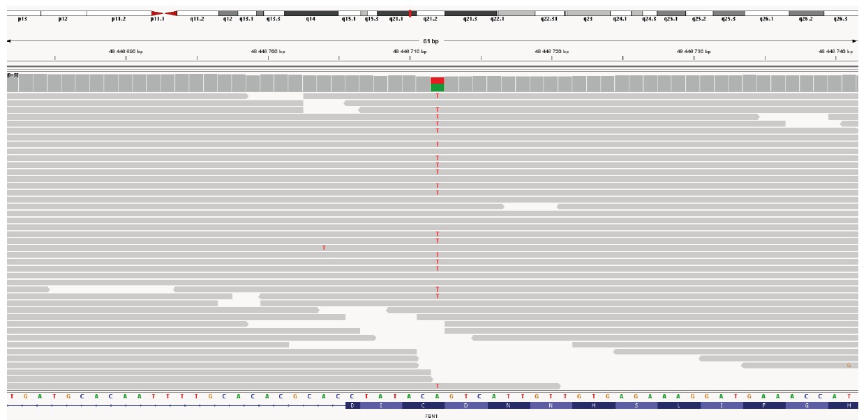 По результатам проведенного полногеномного секвенирования у пробанда и его отца выявлен ранее не описанный вариант нуклеотидной последовательности c.5782T>A, p.(Cys1928Ser) (chr15:48446712A>T, NM_000138.5) в 47 из 66 экзонов гена FBN1 в гетерозиготном состоянии, с глубиной покрытия 42× и 32× соответственно (рисунок 2 и 3).