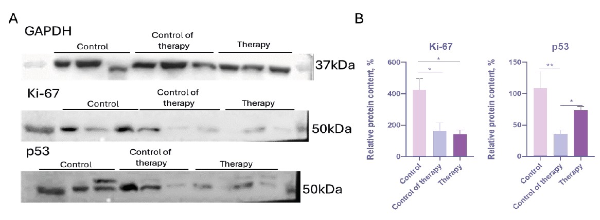 Fig. 1. A. — Western blot analysis of Ki‑67, p53 proteins in endometriosis lesions in the “Control”, “Control of Therapy”, and “Therapy” groups. The reference protein GAPDH was used as a loading control. B — Relative levels of Ki‑67, p53 proteins. Statistical analysis was performed using the non-parametric Kraskell-Wallis test with Dunn’s post-hoc test (mean with SEM)