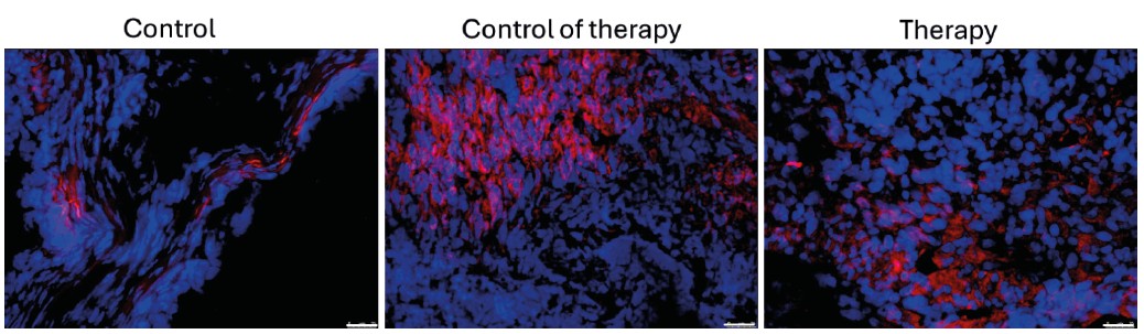Then, to polarize macrophages toward a proinflammatory phenotype, according to the protocol presented in our previous study [3], the cells were incubated with lipopolysaccharide (LPS) isolated from Escherichia coli O111: B4 (Sigma-Aldrich, USA) (100 ng/ml) for 24 hours. Unpolarized macrophages were used as a control for the therapy. Three weeks after transplantation of uterine fragments, the animals were divided into three groups: “Control” — animals with endometriosis that did not receive macrophage therapy; “Therapy control” — animals with endometriosis that received unpolarized macrophages; “Therapy” — animals with endometriosis that were injected with polarized macrophages with a proinflammatory phenotype. After the cells were injected, the animals were removed from the experiment by overdosing them with Zoletil 100 (Virbac, France) and Xylanit (Nita-Farm, Russia) two weeks later. The study was approved by the local ethics committee of the Petrovsky National Research Center for Surgery, protocol No. 3 of March 23, 2023.