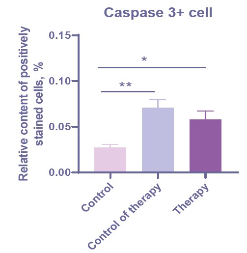 Fig. 3. Relative content of cells positively stained for caspase 3. Statistical analysis was performed using the non-parametric Kraskell-Wallis test with Dunn’s post-hoc test (mean with SEM)