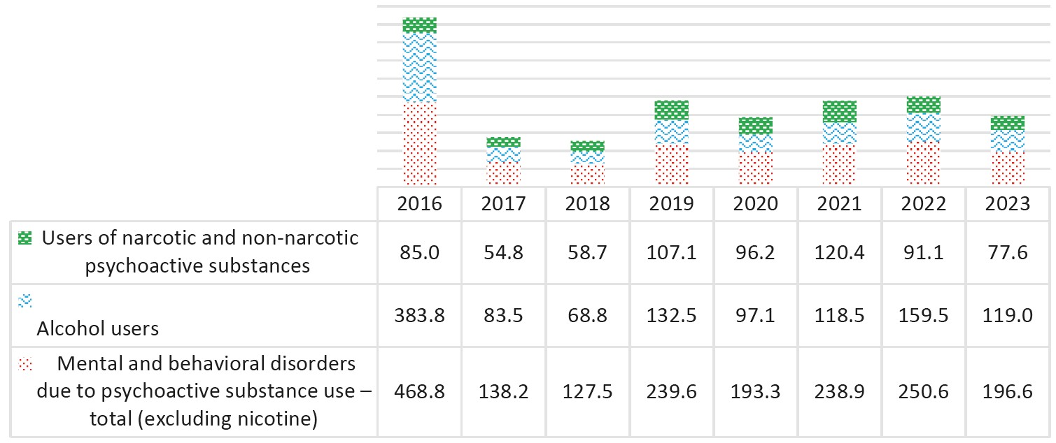 The primary incidence rate of drug addiction disorders includes dependence syndromes on alcohol, narcotic drugs, non-narcotic drugs (other toxic substances) and harmful use (use with harmful consequences) of all listed psychoactive substances, excluding nicotine). Over the period 2016–2023, there was a clear downward trend in the indicator from 468.8 to 196.6 per 100 thousand adolescents, the growth rate was 58% (Figure 1).