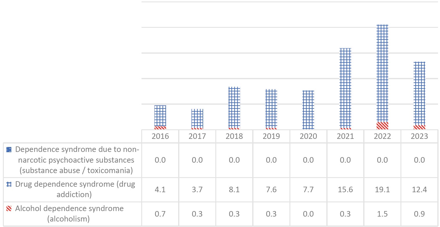The syndrome of dependence on psychoactive substances in teenagers has its own peculiarity. When teenagers abuse psychoactive substances, it does not have time to form yet, and its indicators are significantly lower than the indicators of use with harmful consequences. During the analyzed period, the primary incidence rate of drug addiction increased threefold, and alcoholism increased slightly from 0.7 to 0.9 per 100 thousand adolescents, with the highest value of these two indicators observed in 2022 (Figure 2).