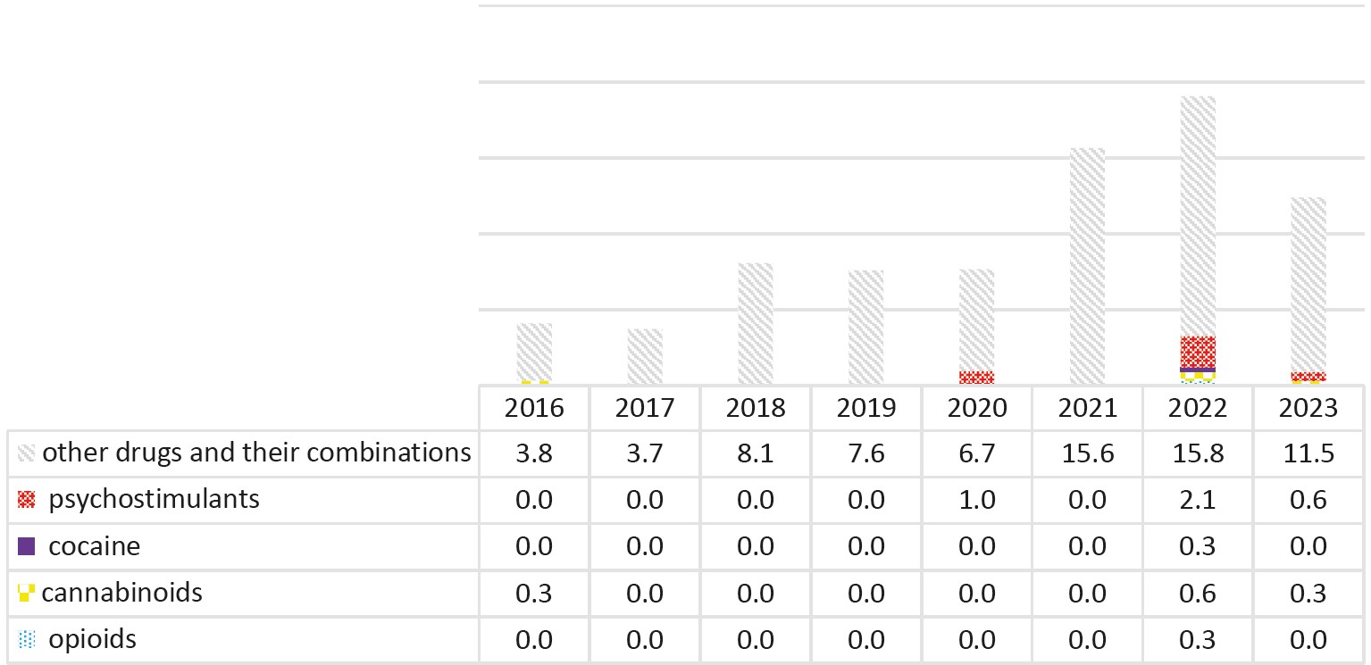 Over the entire analyzed period, the structure of drug consumption among adolescent users was dominated by substances belonging to the group “other drugs and their combinations”, which most likely includes new synthetic or designer drugs, with the peak in use also in 2022 (Figure 3).