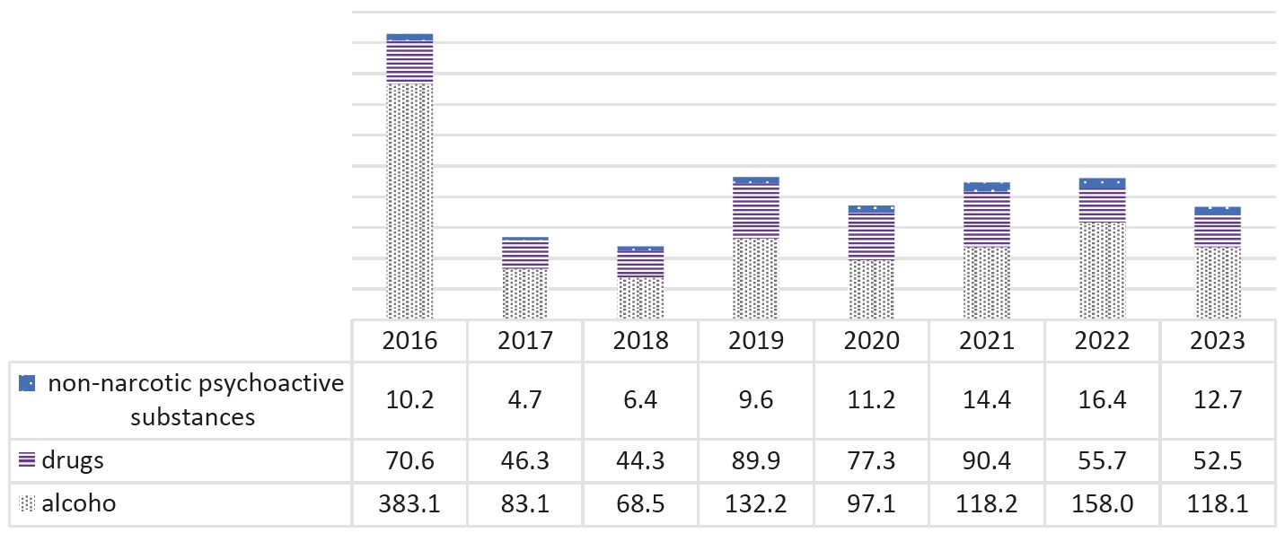 The downward trend in the primary appeals of adolescents for this can be explained by a 69% decrease in the alcohol consumption rate. Over the entire analyzed period, the share of primary appeals among adolescents with alcohol disorders prevailed and only in 2020–2021 the indicator the rate of primary treatment for alcohol disorders was almost equal to the rate of primary treatment for adolescents caused by drug and non-narcotic substance use, then in 2022 the rate of treatment for alcohol disorders increased slightly, and then decreased in 2023 to the level of 2021, and again exceeded the level of primary appeals for drugs and other psychoactive substances. The indicator of primary appeals of adolescents with drug-related disorders caused by drug use and substance abuse per 100 thousand adolescents showed a decrease of only 9%.