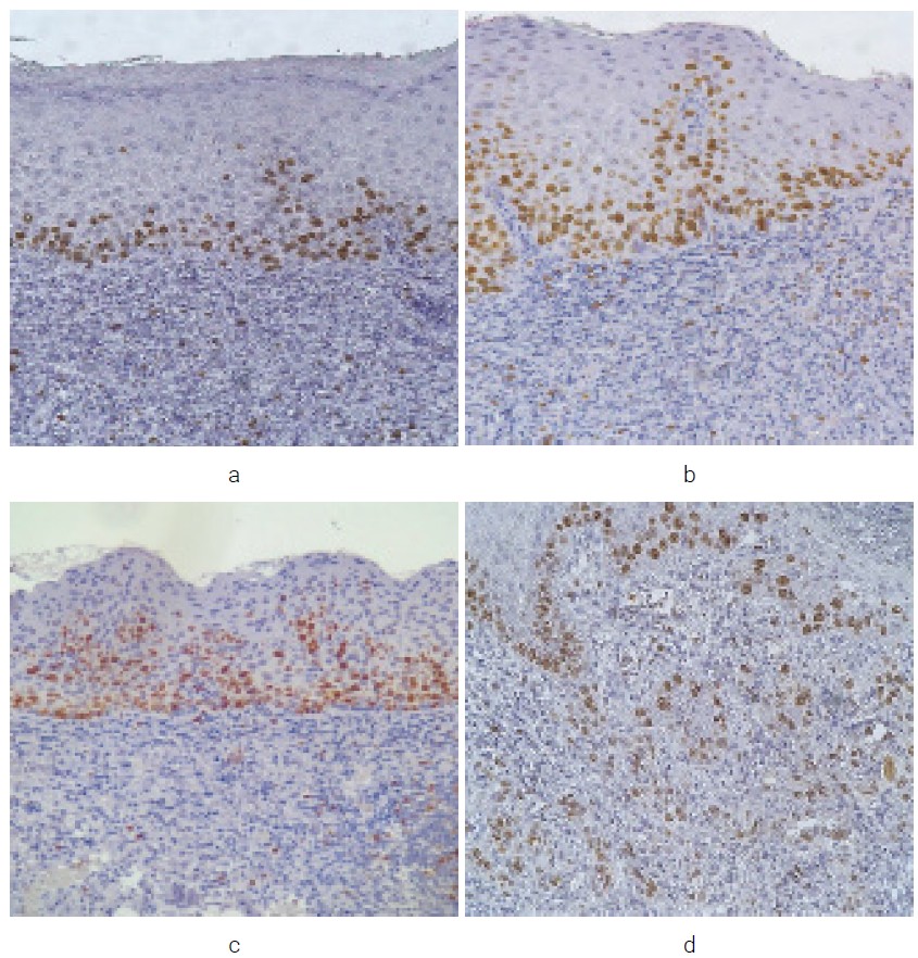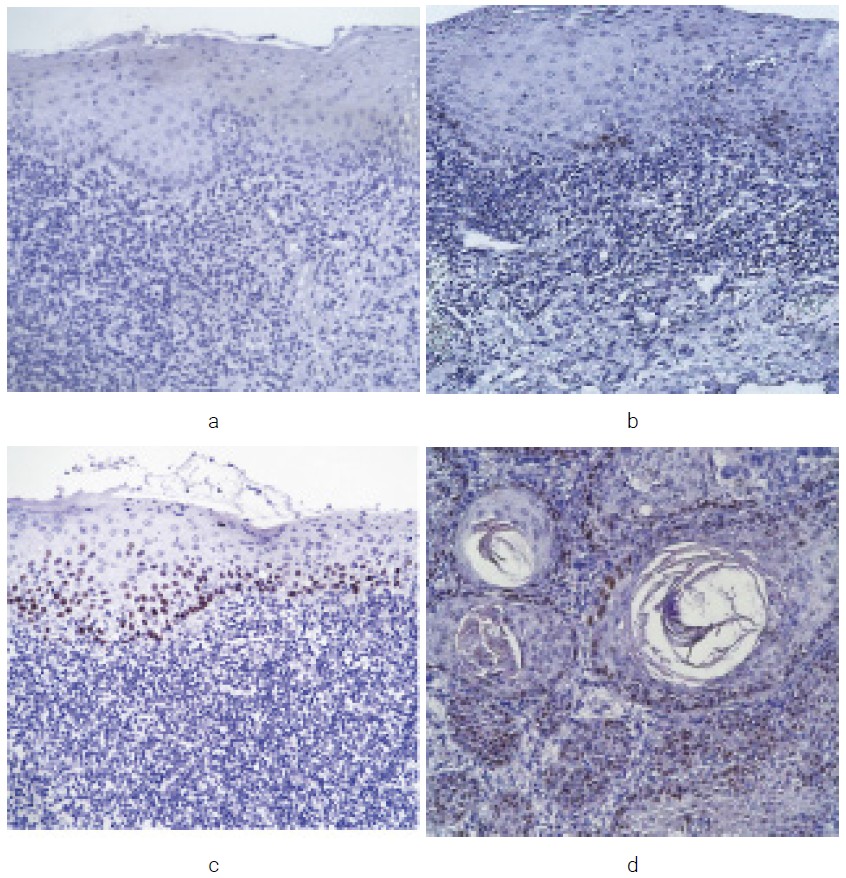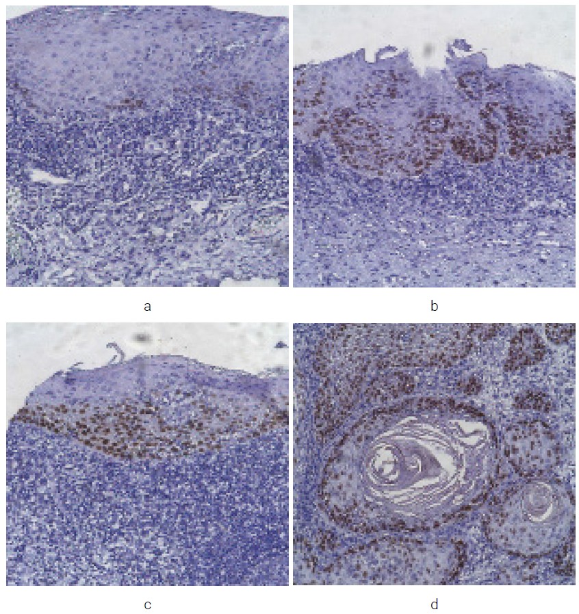 Expression of P53 (Clone Y5) was absent in the EH group. In the LGED group, cell staining was observed as weak in the basal layer. In the HGED group, cell staining was moderate in the prickle layer and strong in the basal layer. In the SCC group, strong cell staining was noted in the central and peripheral zones of the tumor (Figure 4: a, b, c, d).
