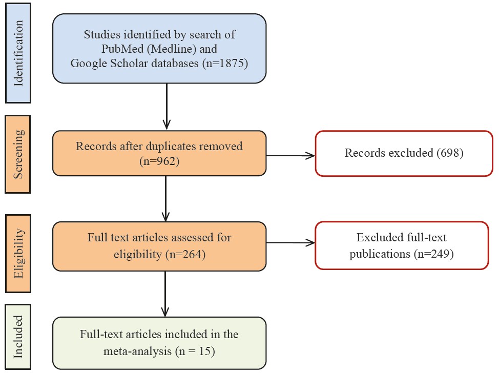 Thus, a total of 264 articles were included in the final list, which underwent full-text analysis. Out of these, only 15 studies met all the necessary inclusion criteria. The total number of patients involved in these studies amounted to 1089. The PRISMA diagram (Figure 1) clearly illustrates the search, filtering, and selection strategy of the articles, which is crucial for understanding the methodology of this meta-analysis.