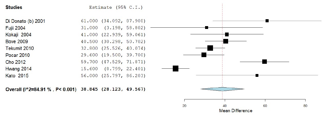 Statistical data processing was carried out using the OpenMeta software (Beta 1.0 version, 2015). The baseline characteristics of patients and clinical outcomes are presented as mean values with 95% confidence intervals (CI). Continuous data were combined using meta-analysis with a random effects model. The heterogeneity of the data was assessed using Cochran’s Q test and the I² test. Survival data 1 year after surgery, collected from each study, were pooled to obtain a weighted average and a 95% confidence interval.