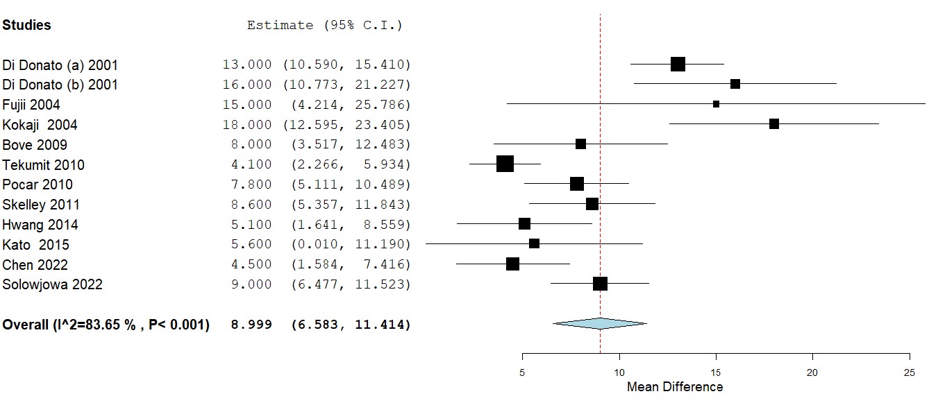 In the study, 11 publications were analyzed, involving 657 patients. As shown in forest plot (Figure 6), after the surgery, the final value of EF significantly increased (p < 0.001) by 9% (95% CI: 6.6–11.4). Adopting the random-effects model, the heterogeneity between the studies was significant (Tau² = 13.8; Q(df – 10) = 67.3; p < 0.001; I² = 83.7). Forest plot (Figure 7) presents data indicating that one year after the operation, EF increases by 10.1% (95% CI: 8.01–12.1, p < 0.001) compared to preoperative levels. Heterogeneity was significant (Tau² = 6.7; Q(df-10) = 29.5; p < 0.001; I² = 69.5). Through the meta-analysis of EF, we studied the treatment outcomes after surgery and one year post-operation. No statistically significant differences in EF were obtained (MD = –2.41; 95% CI: –4.9–0.072, p = 0.057). Significant heterogeneity was observed between the studied stages (Tau² = 7.39; Q(df – 11) = 19.6; p = 0.007; I² = 64.2).
