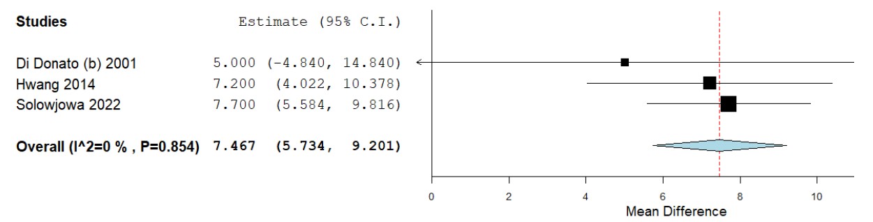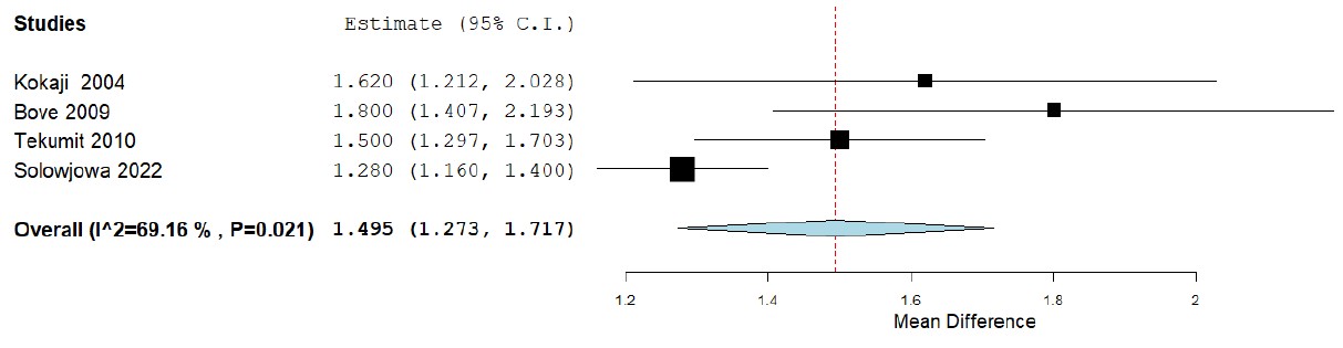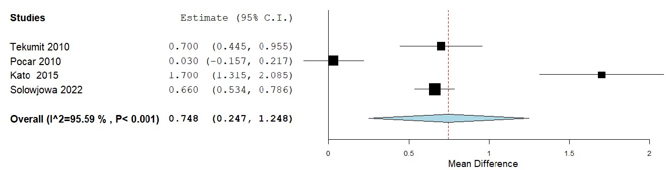 In this study, a meta-analysis of four scientific publications was conducted, which described the results of examinations of a total of 486 patients. A meta-analysis of the difference in mean cardiac index (CI) values in patients before and after the operation was performed (Figure 9). During the meta-analytic assessment aimed at identifying changes in cardiac index, no significant changes were found postoperatively compared to the preoperative period (MD = –0.11; 95% CI: –0.23–0.01, p = 0.07). The heterogeneity observed was moderate (Tau² = 0.007; Q(df – 3) = 5.5; p = 0.14; I² = 45.3).