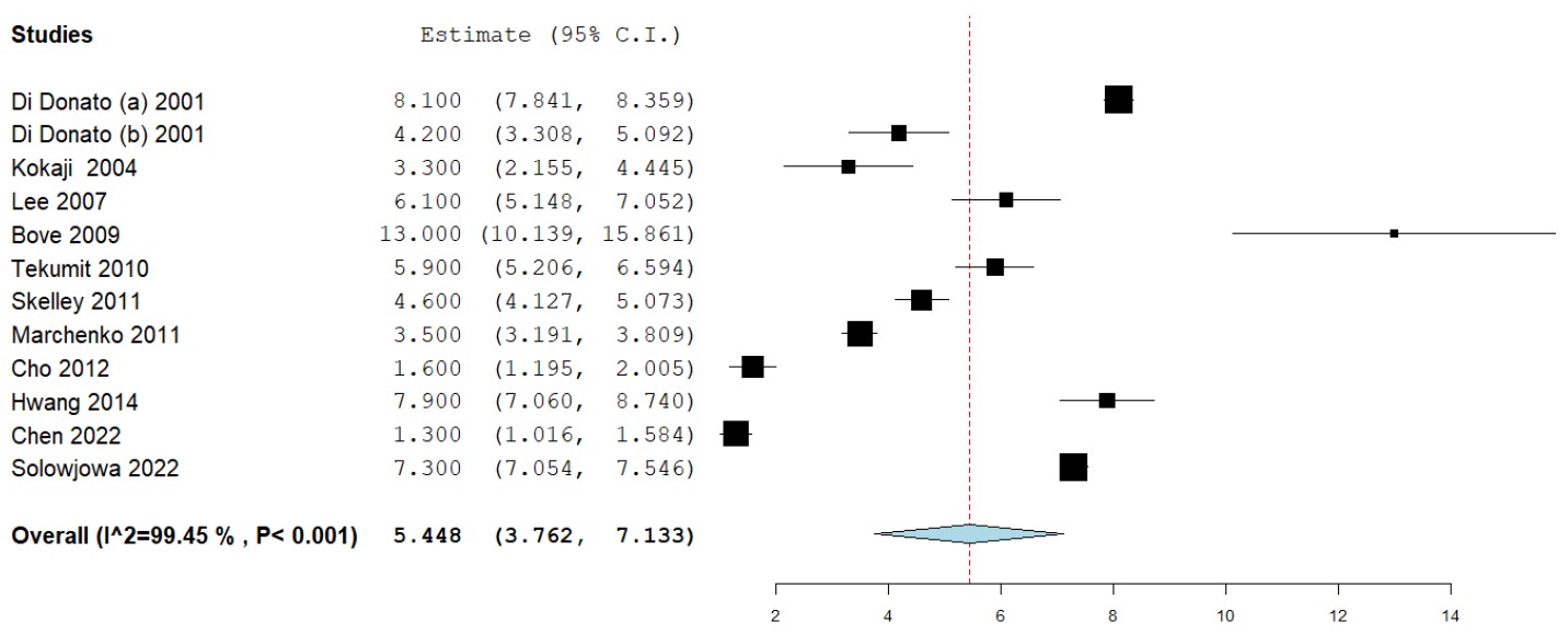 The meta-analytic assessment conducted to study postoperative mortality includes 11 different publications, analyzing a total of 951 patients. According to the data presented in the forest plot (Figure 15), the level of postoperative mortality was 5.4% (95% CI: 3.8–7.1). There was great heterogeneity between studies (Tau² = 8.6; Q(df – 10) = 1998.6; p < 0.001; I² = 99.5), so we pooled the data under the random-effects model.