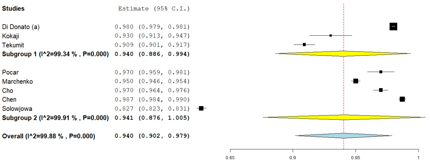 The study of patient survival after surgical left ventricular reconstruction has provided fundamentally important information about the mid-term outcomes of this procedure (Figure 16). This research analyzed eight scientific articles involving 788 patients who underwent the surgery. The results indicated that one year after the surgical intervention, the survival rate was 94% (95% CI: 90–98), with significant heterogeneity (Tau² = 0.003; Q(df-7) = 6023.9; p < 0.001; I² = 99.8).