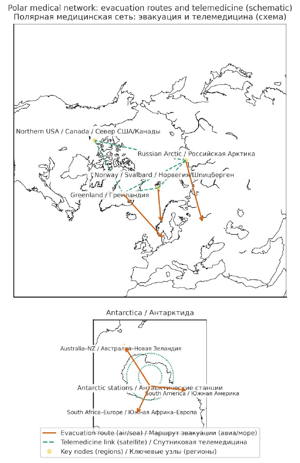 Маршрутизация и планирование эвакуации | Станция, малый стационар, региональный центр | Оценка времени эвакуации, погоды, доступности бортов, готовности принимающего центра; использование «окна погоды» | Необходимы заранее отработанные схемы взаимодействия с SAR (поиск и спасение) и авиацией, несколько резервных маршрутов |