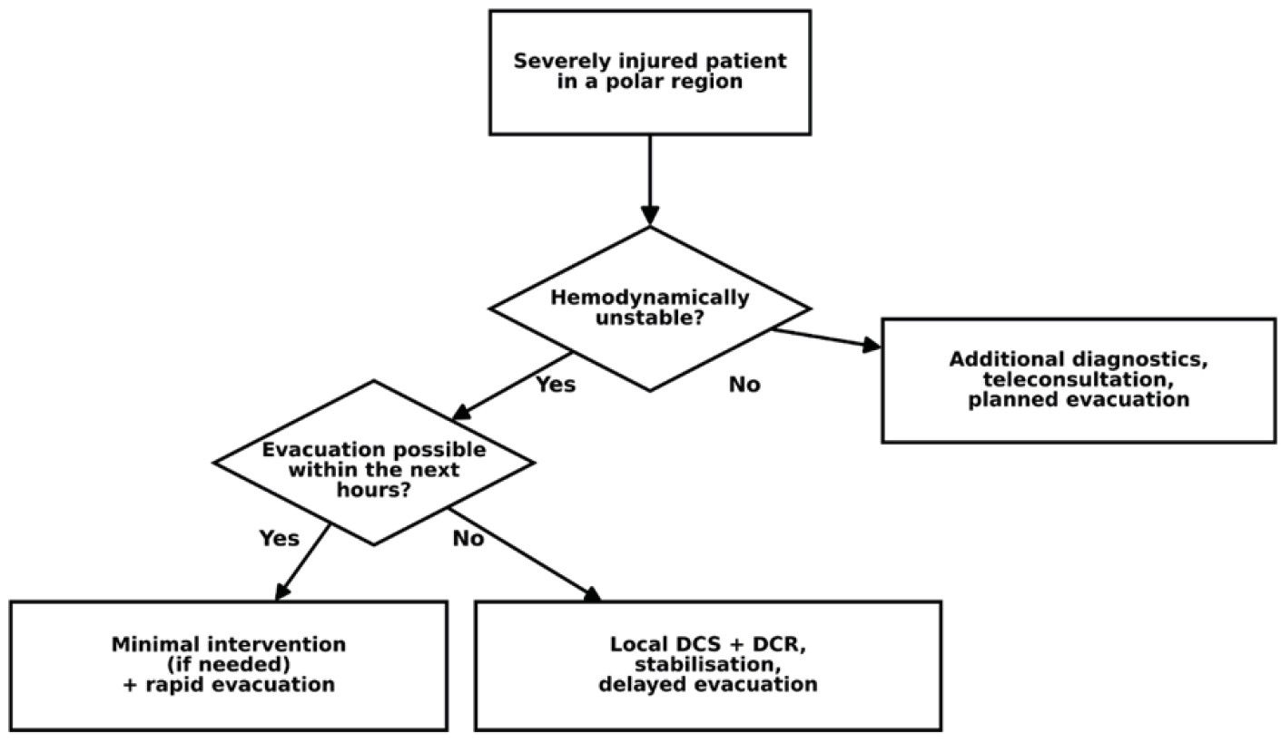 Application of DCS principles | Small hospital, polar station, ship | Only the minimum necessary intervention (haemorrhage control, temporary stabilization of injuries), with deferral of definitive reconstruction in the setting of physiological instability | Requires prior rehearsal of algorithms and a clear understanding of the limits of the intervention |