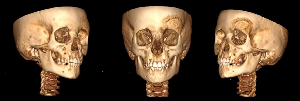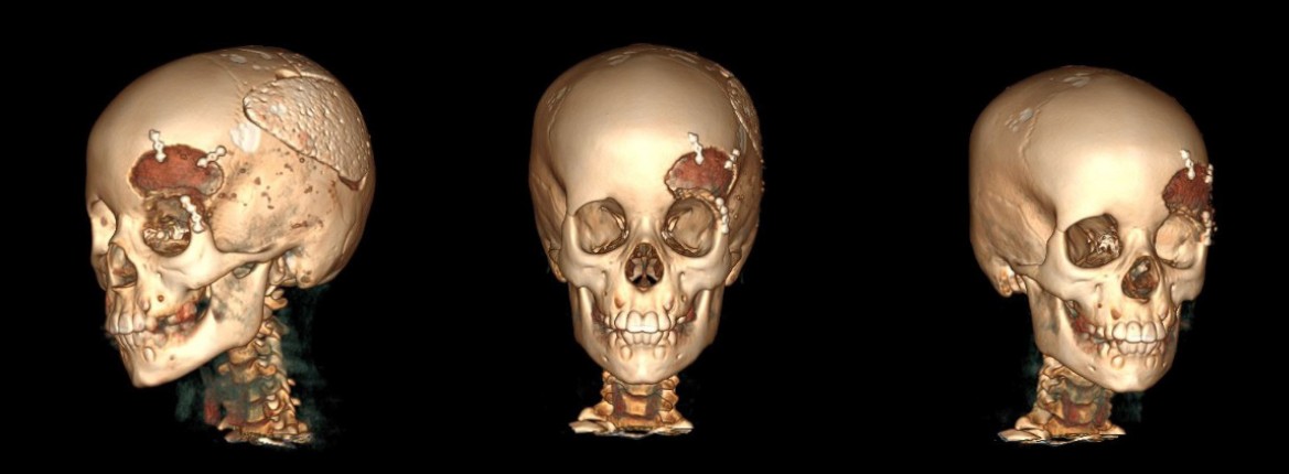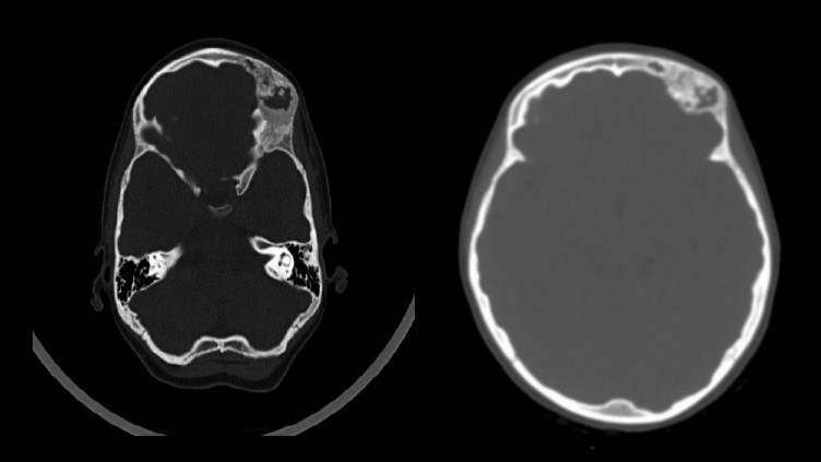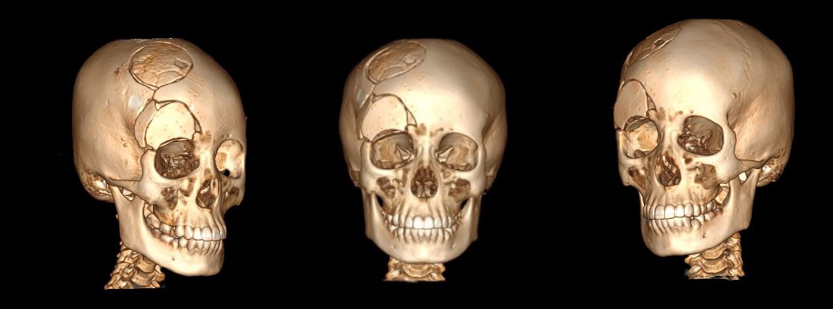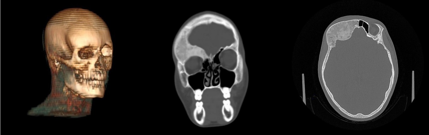 A 9 year old girl presented volume formation and growth in the right frontal bone in the winter of 2021. Due to no complain by this formation, the patient did not received any treatment back then. The patient was admitted to the RCCH for the first time for examination and treatment 2022, where a MSCT was done, due to notable facial asymmetry.