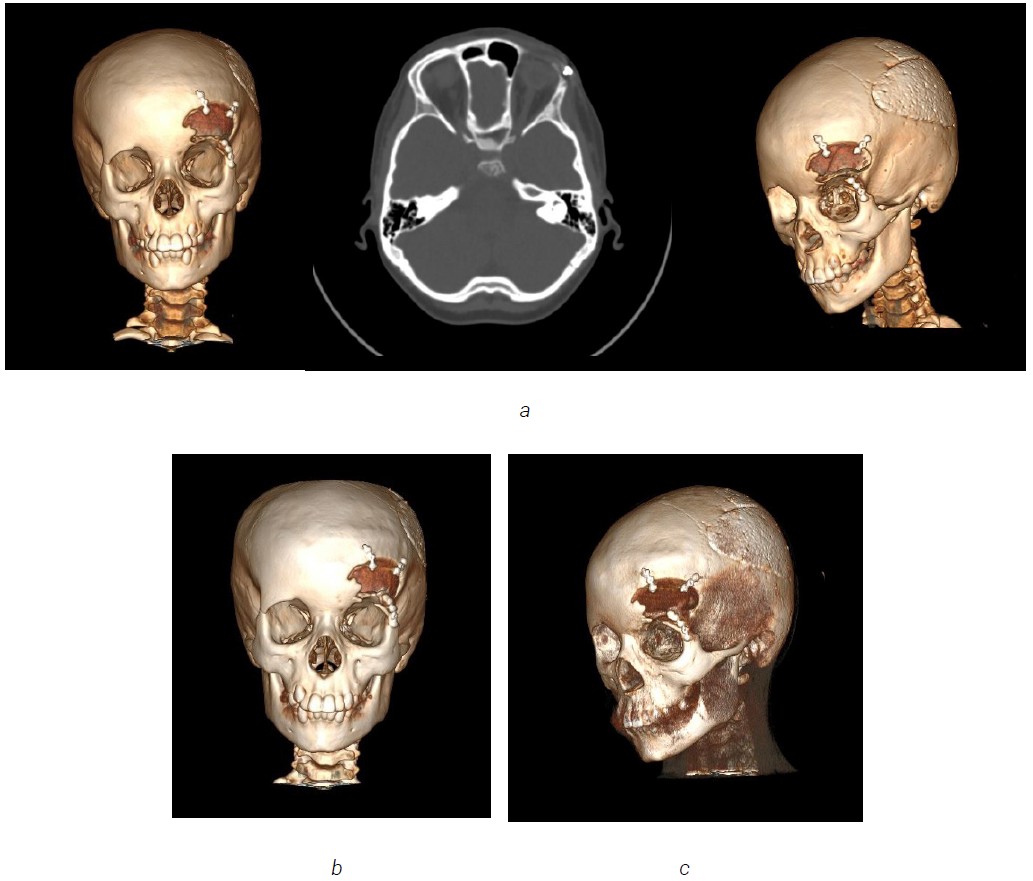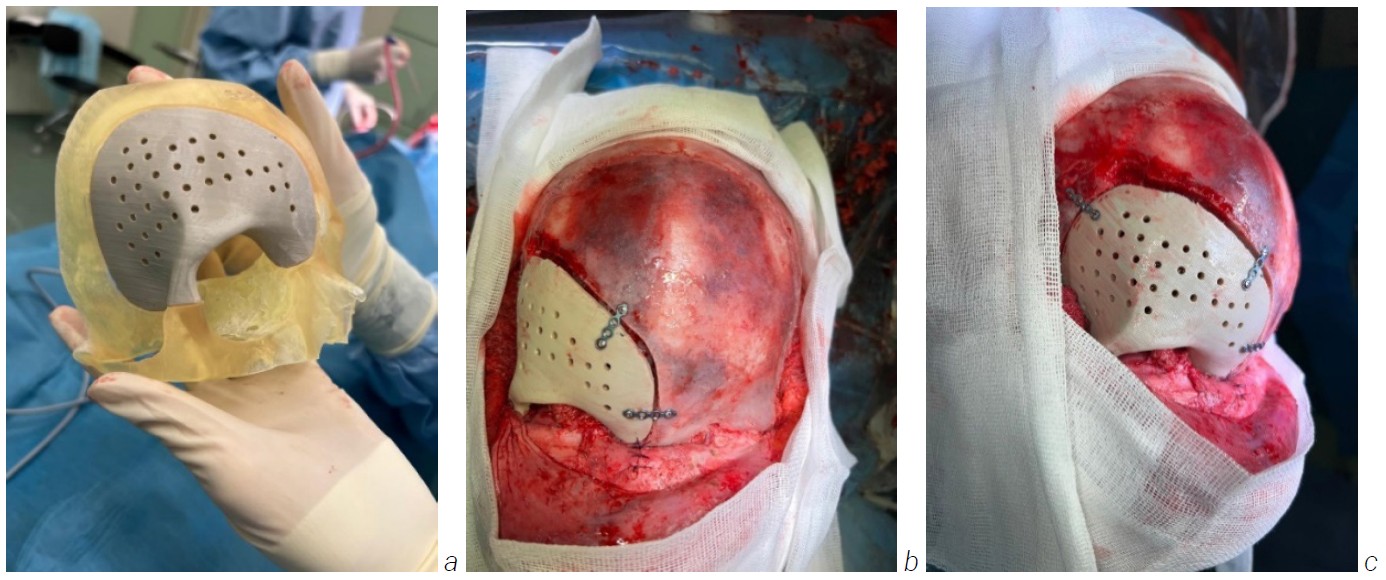 Fig. 6. A synthesis polyethertherketone (PEEK) implant. a — 3D PEEK Customized Implants designed individually for the patient to replace bony voids in the cranial and craniofacial skeleton; b and c — intraoperative view following fixation of polyetheretherketone (PEEK) implant with mini-plate and mini-screws