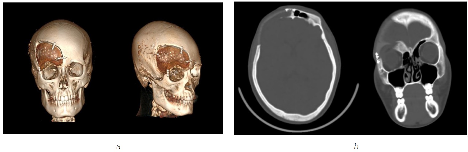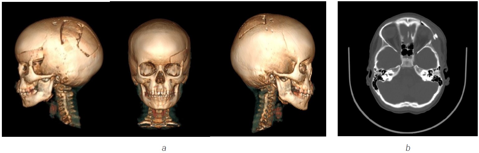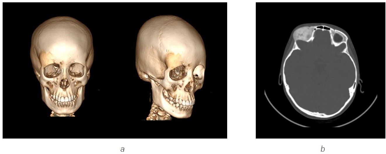 Fig. 14. The edema and deformity in the right frontal bone. a — 3D computed tomography image shows increased dimensions of the right frontal bone; b — axial computed tomography image with expansion of right frontal bone