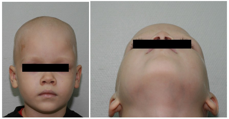 Fig. 8. Appearance of the child upon admission at RCCH on 2016, with forehead highlighting the gross asymmetry of the left supraorbital rim in comparison to the contralateral side. The skin above the formation is unchanged