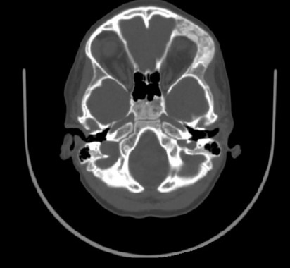 Fig. 9. Preoperative axial CT image exhibiting characteristic homogeneously dense appearance of fibrous dysplasia involving the left frontal bone