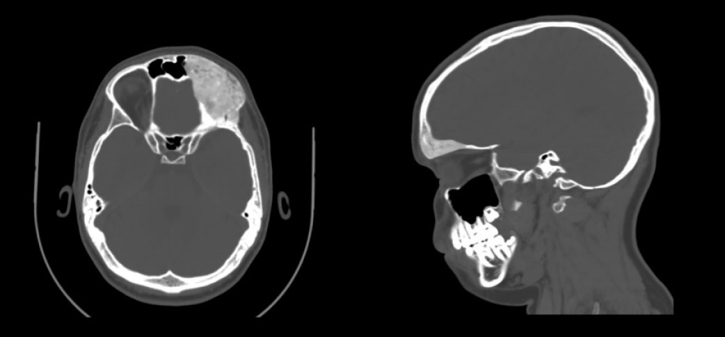 A 17‑year-old male had a multi-slice computed tomography MSCT scan due to asymmetry observation in his forehead on the end of September 2023 which raised suspicions of a pathological formation. Upon consultation at RCCH at the beginning of July 2024, the patient was admitted in to the maxillofacial surgery department for further treatment and observation.