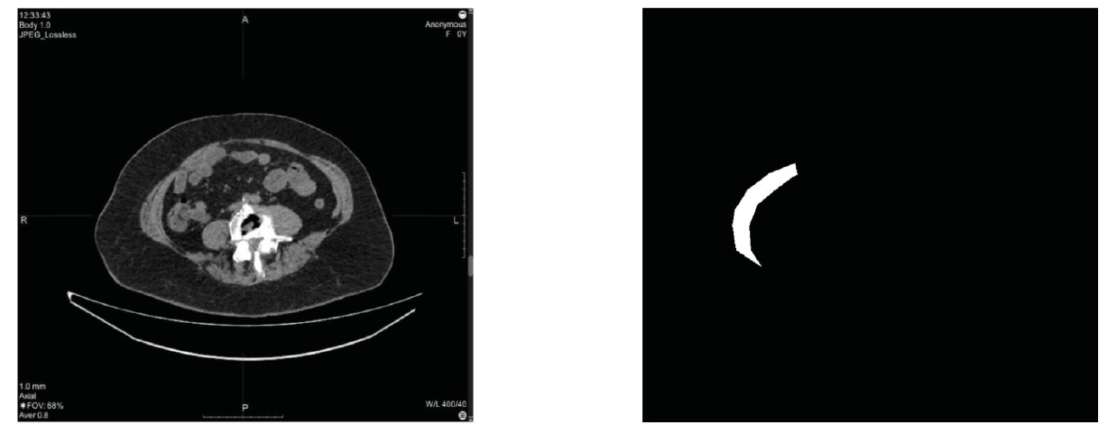 Fig. 2. An example of a CT scan and the corresponding mask of the musculo–aponeurotic layer of the anterior abdominal wall on the right