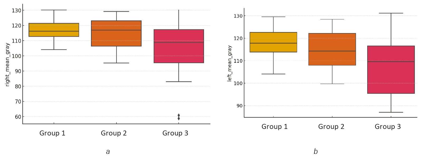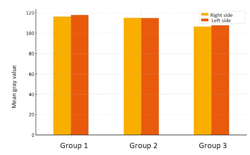 The gray density (brightness) analysis of the segmentation masks revealed that Group 1 exhibited the brightest masks (right_mean_gray = 116.41, left_mean_gray = 117.82), which may indicate lower tissue density (Figure 3).