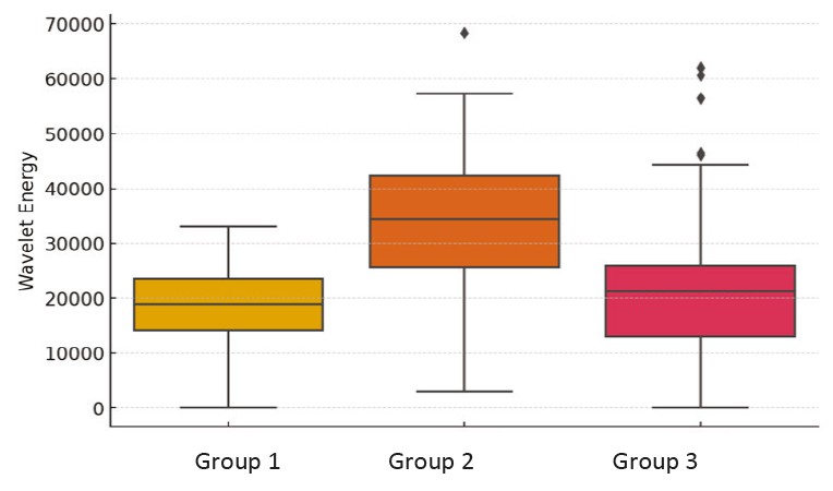 Descriptive statistics revealed differences between groups in several key characteristics, as confirmed by analysis of variance (ANOVA) and the Kruskal–Wallis test. Statistically significant differences (p < 0.05) were observed for contrast and correlation on both the right and left sides, specifically: right_contrast (p < 0.0001), right_correlation (p < 0.0001), right_homogeneity (p < 0.001), left_contrast (p < 0.0001), and left_correlation (p < 0.0001). At the same time, features such as right_energy, right_lbp_mean, left_energy, and left_lbp_mean did not exhibit significant differences between groups, suggesting the similarity of these parameters across different clinical categories. Texture analysis demonstrated that the Wavelet Energy metric differed significantly between groups (ANOVA: p < 0.0001, Kruskal–Wallis test: p < 0.0001) (Figure 5).
