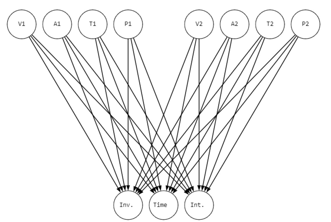 На рис. 1 наглядно представлено, что элементы иммерсивности: как виртуального (V1, A1, T1, P1), так и реального мира (V2, A2, T2, P2), влияют на поведенческие реакции (Inv., Time, Int.). Для создания полной вероятностной модели с использованием цепного правила Байеса мы сначала должны определить вероятностные зависимости между всеми переменными, как они представлены на схеме.