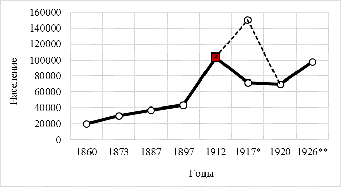 Figure. The Yekaterinburg city population dynamics, latter half of the 19th – first half of the 20th century