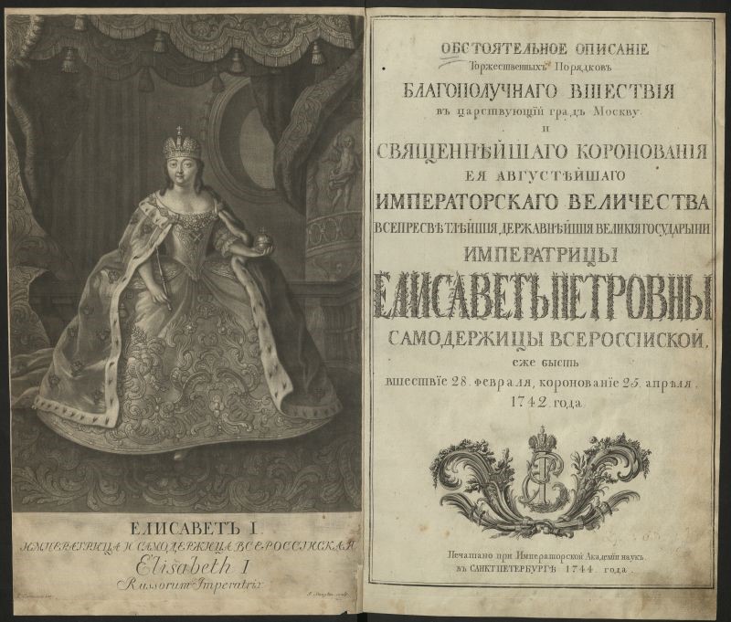 25 Obstoiatel'noe opisanie torzhestvennykh poriadkov... sviashchenneishago koronovaniia eia avgusteyshago imperatorskago velichestva... gosudaryni imperatritsy Elisavety Petrovny (St. Petersburg: [N.s.], 1744), 1.