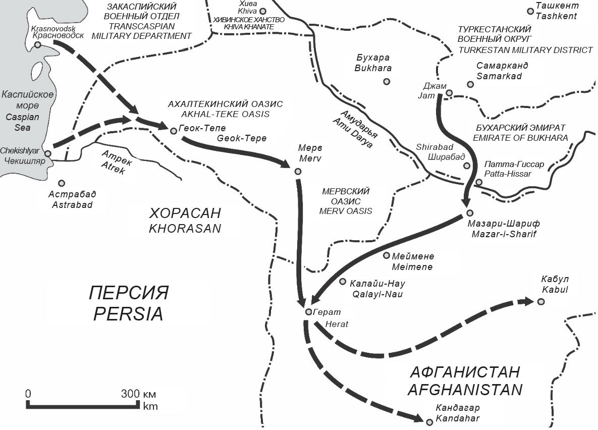 - формирование приблизительно равного по силе отряда в Закаспийском военном отделе из войск Кавказского военного округа и движение его в туркменские степи, в Ахалтекинский и Мервский оазисы
