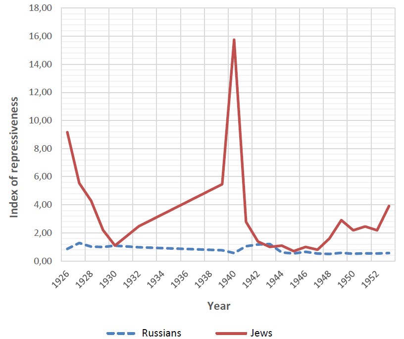 Figure. Index of ethnopolitical repressiveness of Russians and Jews in 1926–1953