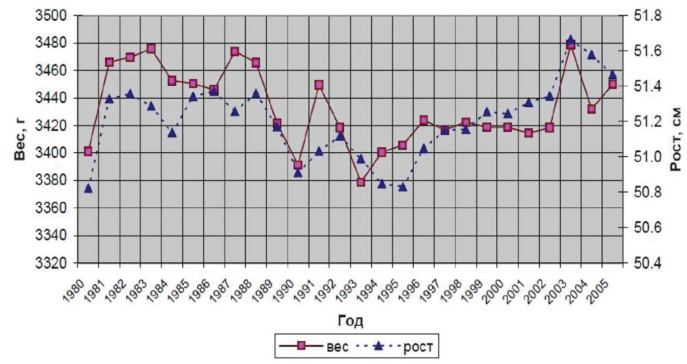 Источник: Миронов Б.Н. Биологический статус населения Санкт-Петербурга в 1946–2005 гг. (по антропометрическим данным о новорожденных и их матерях) // Мир России. 2007. № 1. С. 99–146. EDN: HYVXFT