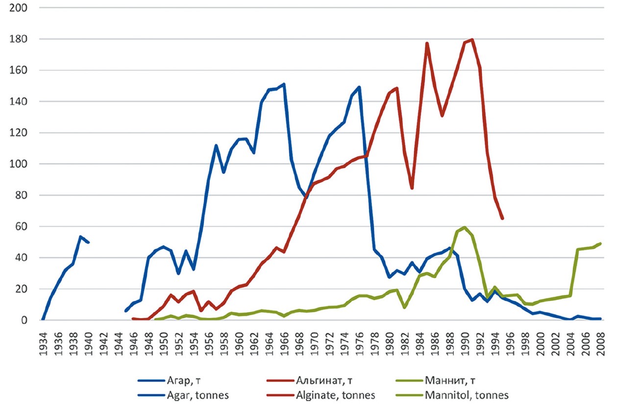 Несмотря на объективные трудности, всегда связанные с пионерной стадией развития предприятия[21], и высокую погодовую амплитудность производства, очень быстро от первых тонн агара завод перешел к выпуску десятков тонн (в 1939 г. – 53 т), тем самым на порядок превзойдя объемы производства йода из ламинарии в 1910–1920-е гг., во втором Кондратьевском цикле.