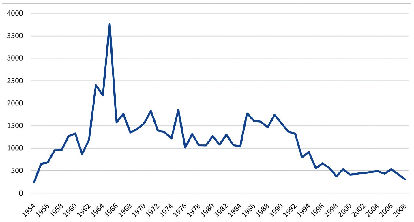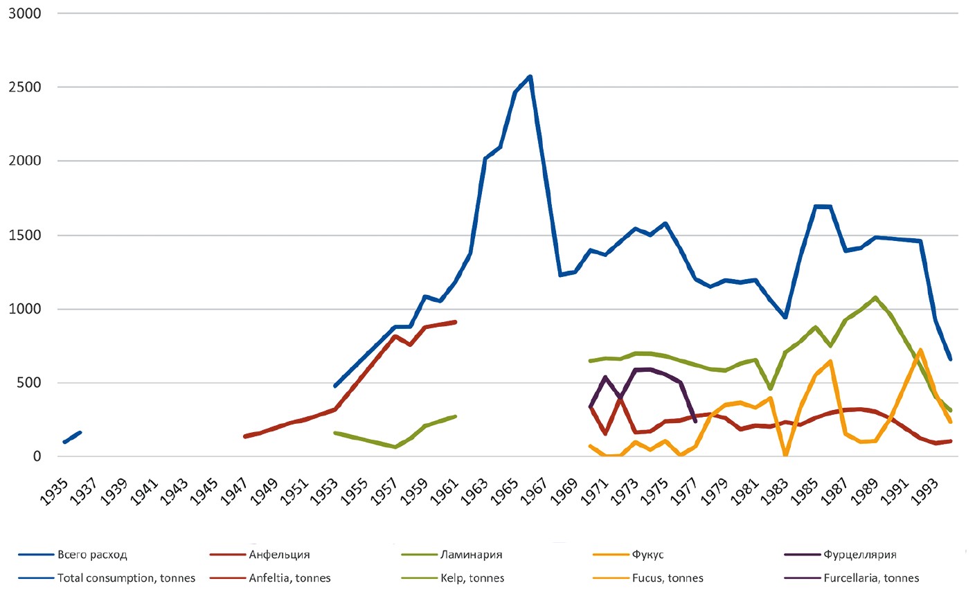 Динамика ежегодного количества поступивших водорослей для переработки (рис. 2) позволяет отчетливо обособить два временных периода в работе комбината: 1) экспоненциального роста 1954–1965 гг. с достижением пиковых значений в 3754 т в 1965 г. и 2) резкого спада 1965–1977 гг. с последующей стабилизацией около 1200–1300 т к концу периода в 1977 г. Аналогично поведение графика расхода всех видов водорослей, со смещением пикового значения в 2574 т на 1966 г. (рис. 3).